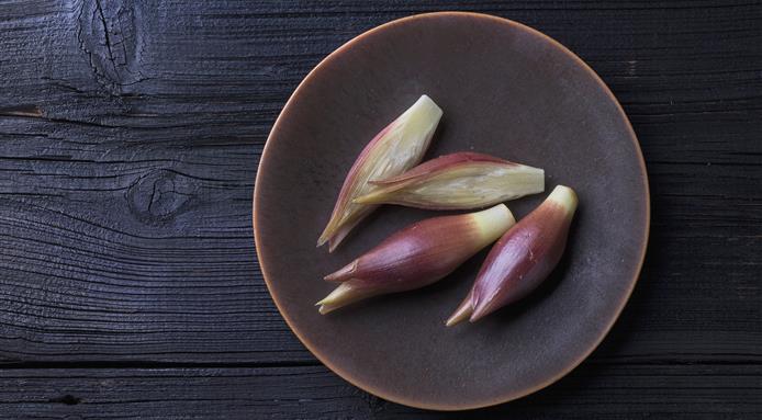 The buds of the deciduous perennial plant are commonly used as a garnish, found thinly shredded and scattered on steamed rice, hiyakko, miso soup, cold soba noodles and somen, although they can also be pickled.