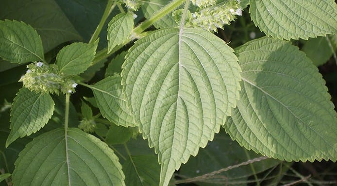 Aromatic perilla leaves are commonly used in many Japanese dishes like sushi for their unique citrusy, peppery, minty flavor as well as coming in handy as a garnish on salads and noodles.