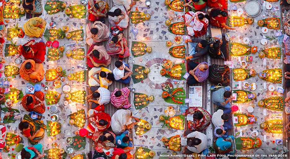 The Bangladeshi photographer Noor Ahmed Gelal was announced as Pink Lady® Food Photographer of the Year 2018 with his stunning image Praying with Food (in the picture above of the article), which shows a section of the Hindu community while preparing to break the day-long fast in one of the local temples at Swamibag, Dhaka, Bangladesh. This picture also won the 1st Prize for the category Food for Celebration.