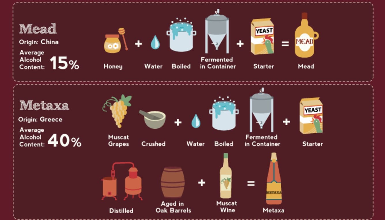 This infographic from WineBags.com lists 49 different drinks and the ingredients that go into making them. Alongside the ingredients the infographic also gives info on the specific processes that each drink undergoes during production.