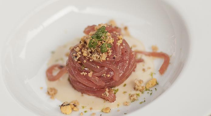 This mouthwatering spaghetti recipe from chef Enrico Cerea (three Michelin stars) features tuna noodles with a lush anchovy sauce, pistachio crumbles and lemon zest.