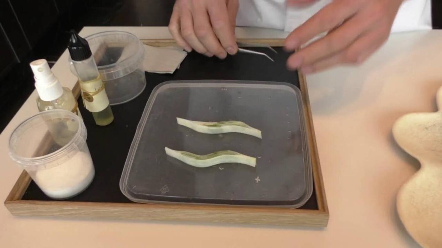 Chef Fran Agudo creates an exquisite asparagus dish from the popular Tickets restaurant in Barcelona. White asparagus is cooked inside a salty meringue in the oven, then topped with a vinaigrette of laurencia, and sea grapes.