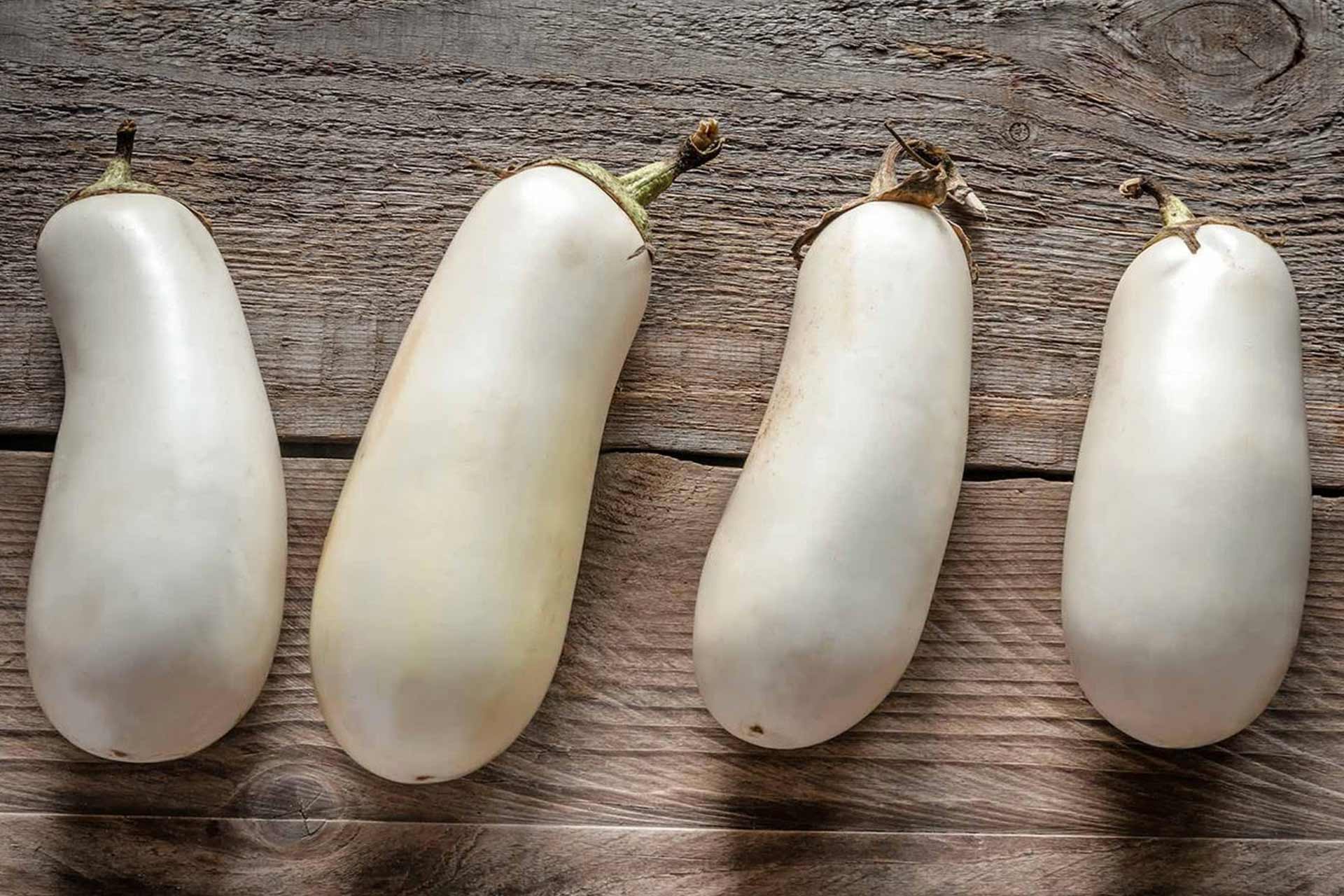 White eggplants are a variety of regular purple eggplant, belonging to the nightshade family along with tomatoes and peppers. They are slightly curved and oblong in shape, with a creamy white flesh speckled with edible white seeds.