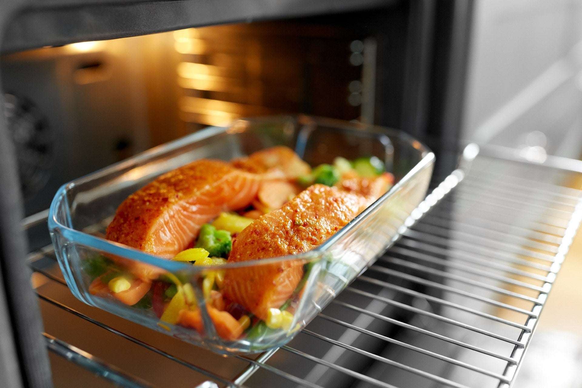An ovenware dish containing two salmon fillets set on vegetables entering oven