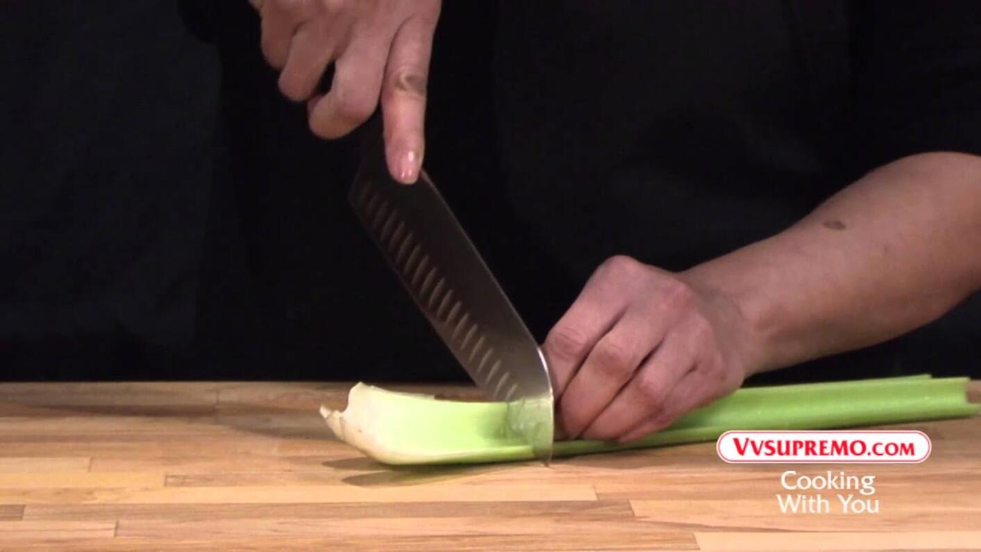 Separate the desired celery stalks you wish to cut. Wash them under running water, rubbing them lightly to loosen any debris (especially near the root). Dry with a towel.
