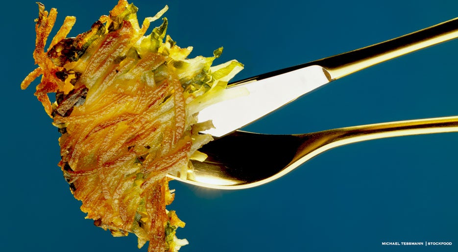 Such a simple recipe, what could go wrong? A good question. In fact, more than you might think. The main danger is that potatoes have too much water content to just grate and fry without causing a splatter- fest. If you parboil the potatoes and let them cool before grating them, they will release less water. Likewise if you grate them, then sprinkle them with salt, the salt will draw out moisture. Less water content means a crisper fry, and also less of a mess in the kitchen. Some hardcore Rösti-makers chill the potato first, then grate the potato a day in advance. They grate more cleanly when cold, and moisture evaporates overnight, meaning less water content. But this seems a bit like creating work for yourself, when it comes to such a simple dish. One important component is the potato skin—most Rösti are cooked with the skin. The skin has the majority of nutrients in it, and has a great flavor. It just has to be spotlessly clean, and preferably a potato variety that has a nice, easy-going skin (some can be tougher and more fibrous, and therefore better peeled—the later the harvest, the firmer the skin). There is also no consensus on which potato to use: varietals that might be called “floury” (high in starch, low in moisture) result in a Rösti that tastes more like a mashed potato cake, whereas potatoes that might be categorized as “waxy” (high in moisture, low in starch) tend to be crunchier—I prefer the latter, which reminds me of potato latkes, a Jewish Hannukah tradition, often eaten with sour cream or apple sauce.