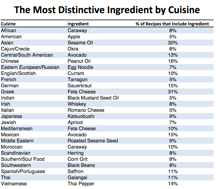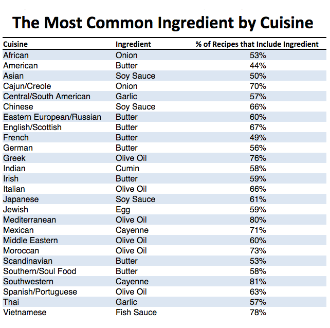 Whilst the view is through an Americancentric lens, the results show there is a clear difference between the most common ingredients found in different types of cuisine. Perhaps unsurprising news, but a closer look sheds interesting light.