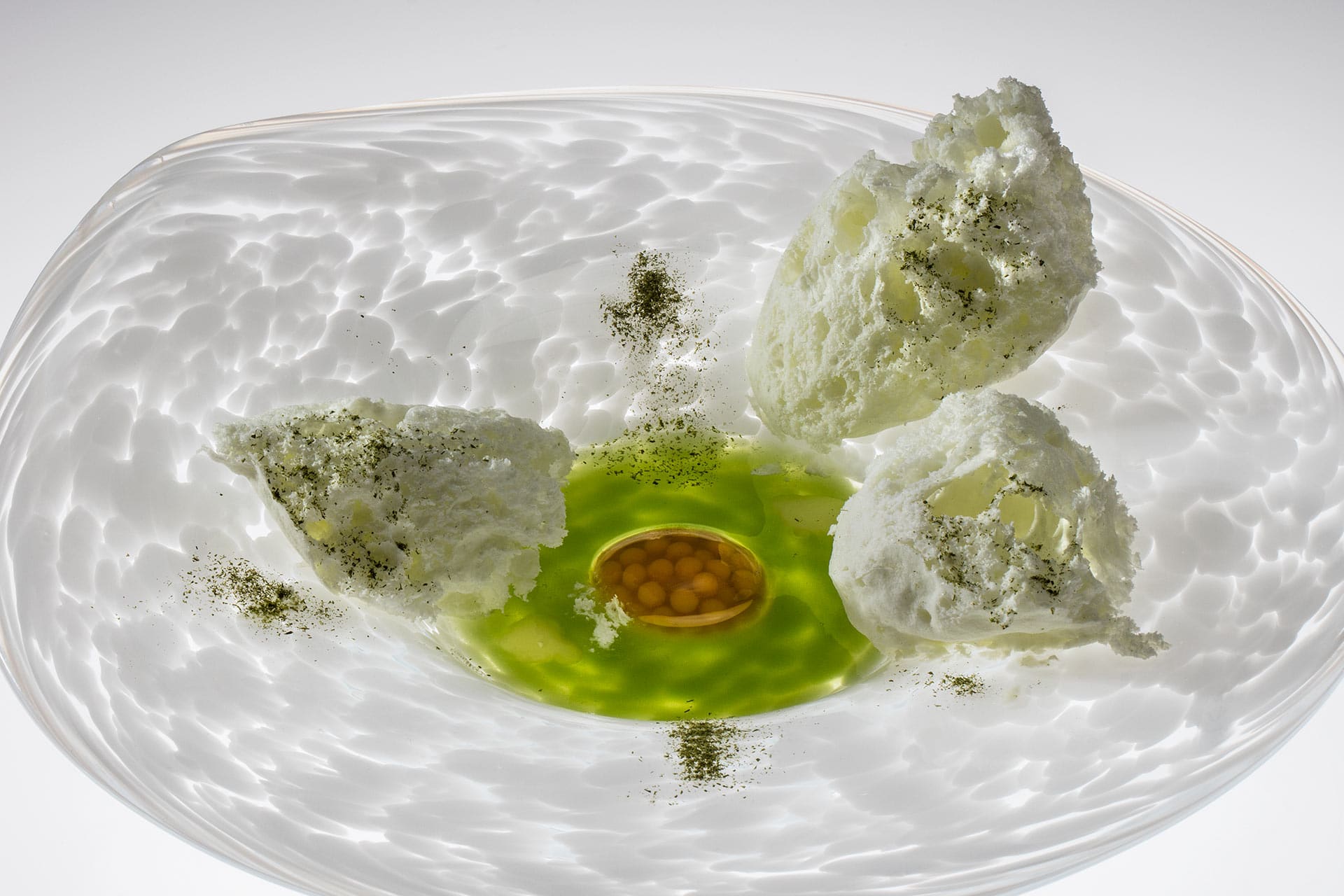 Multi spherical tatin of corn and foie – It was the first dish we made with the multi spherification technique (the technique allows us to prepare a lot of dishes and now it’s spread all over the world). This dish seems a tarte tatin (cake); the corn multi spherification could remind the tatin apple slices, it’s not the same, but it’s in a conceptually way.