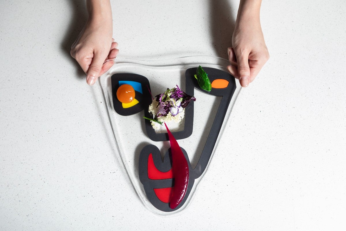 “This course was a collaboration with Raspy Rivera and Takara Designs. We asked Raspy to craft custom serviceware inspired by her artwork. Guests engage in assembling a puzzle at their tables, which magically transforms into their personalised serviceware. Raspy's artwork, often centred around self-reflection and the mirroring of faces, takes on a tangible form as diners piece together a face in front of them. Then the course, featuring a winter kale salad, joined in a trio of colours, is served directly above it.