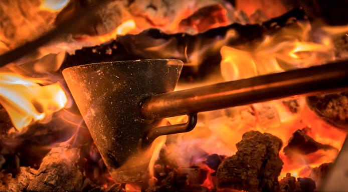 The iron cone should be placed directly into the hottest of embers or coals of the fire until it's glowing red hot. Then pork lard or beef tallow can be placed into the cone and when the fat bursts into flames, renders and drips out of the bottom of the cone while still on fire, make sure it drips onto your food of choice!