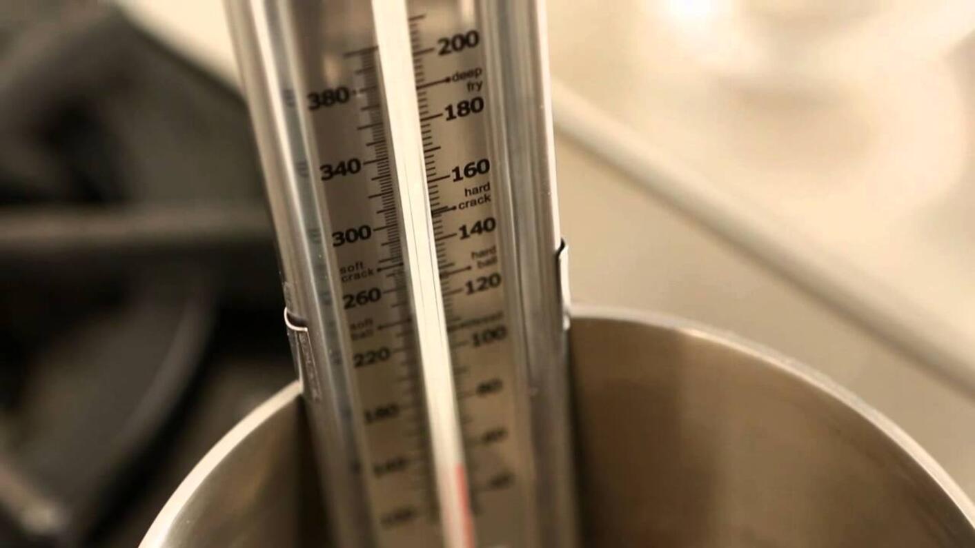 - Heat sugar and water to between 110 and 120 ° C. Use the thermoprobe (candy thermometer) to determine when it has reached this point.