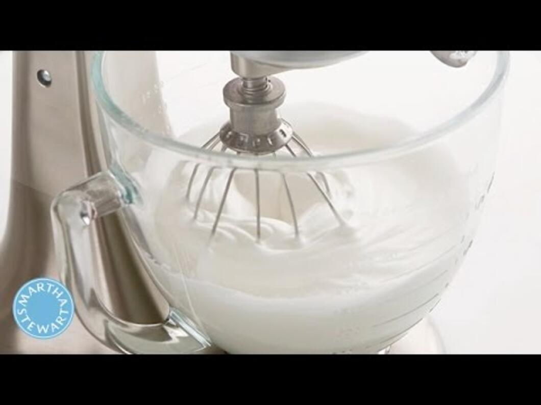 - Slowly drizzle in hot syrup while mixer is still running.