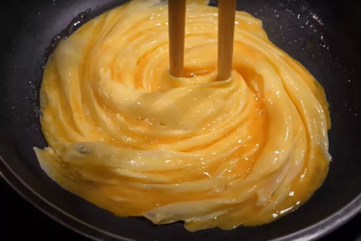 In this video, the egg mixture is made by adding all the ingredients together and beating the egg with an immersion blender. This gives it a perfectly smooth texture and consistency, which is important when pulling the omelette together. Heat the oil, and when the pan is hot, add a ladle full of the egg mix. When the edges become white and fluffy, it’s time to start turning with the chopsticks. You might find it easier to turn the pan, rather than the chopsticks. It’s important to remember that you need to speed up as you turn the tornado eggs and not slow down, because the edges will begin to cook faster as the tornado shape forms in the middle of the pan. So practice your movement plenty of times before attempting to do the real thing.