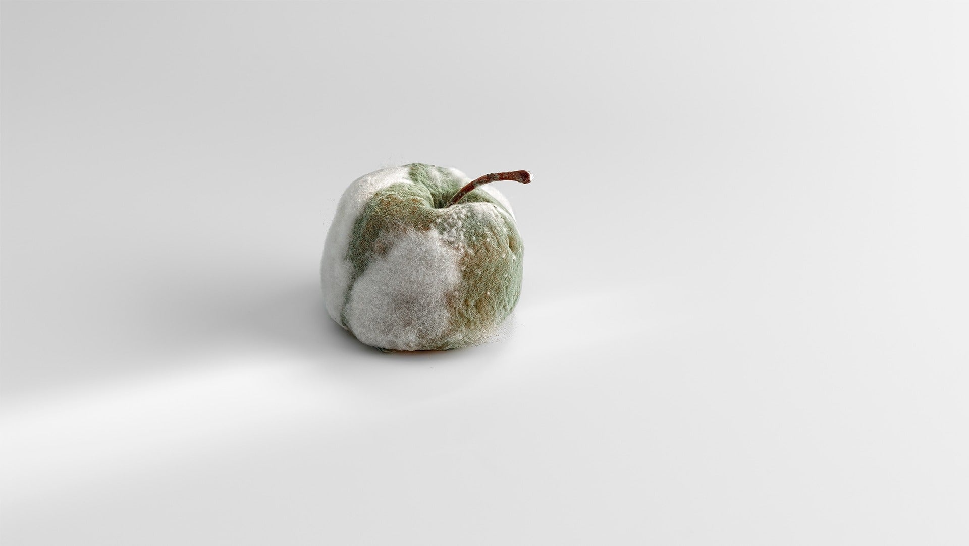 In this photo, you probably think you see a bad apple. In reality, it is an apple fermented with penicillium candidum and penicillium roqueforti, topped with orange marmalade.
