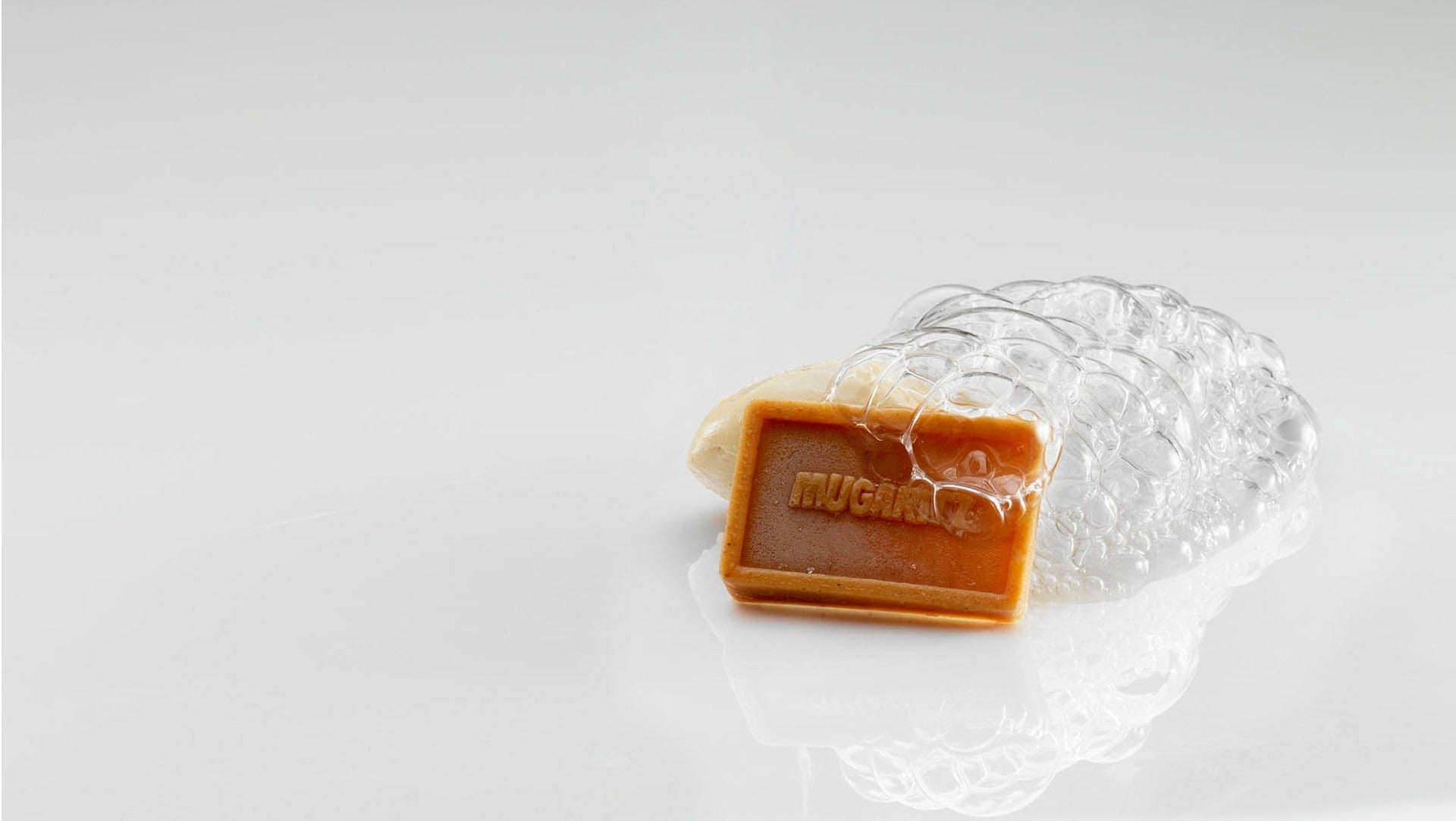 This soap is the trompe-l'oeil which will be presented on an episode of Top Chef. Aduriz says: "The world of cosmetics increasingly enters that of gastronomy. In shampoos, there are more and more ingredients that are used in the kitchen, such as honey, oats, flowers, apple." The chef wanted to reverse these codes and bring gastronomy into the world of cosmetics by designing a dish made from oat milk and rice, moulded like soap. For the bubbles, it took "a year of work with an engineer" to develop a pump capable of producing stable bubbles with a honey flavour.