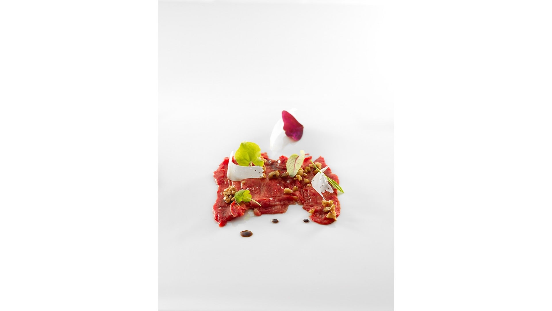 At first glance, this photo represents a plate of beef carpaccio. It is, however, a watermelon carpaccio, born with a slice of luck. "While we were wondering if it was possible to replace vegetables with fruit in our broths, stir-fries, or creams, we forgot one of these fruits in the oven: it burned. We had two options: the most logical one, that is to say, throw the product; and the craziest, to see it from another point of view," says the chef. "The fruit still tasted like watermelon but looked like meat. So we decided to play with it and that's how this dish was born."