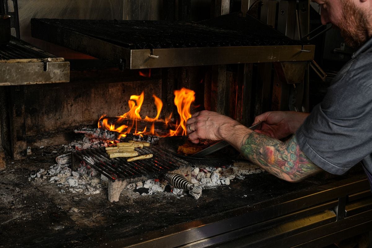 1. Start a fire with a few logs and let the wood burn out completely into charcoal or light conventional charcoal.