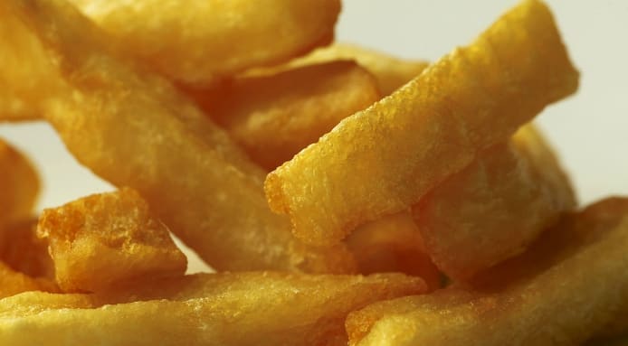 The potatoes are first simmered and then fried twice, but crucially placed in the fridge in between cooking stages to remove all the moisture. And it's hard to argue with the results.