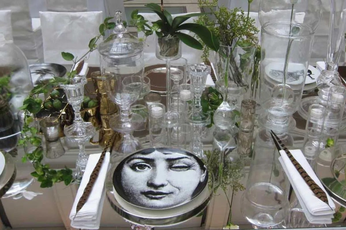 To create a rich, inviting table, be careful not to clutter it with too many objects. You should follow a certain logic when it comes to setting a table. You can pick out different models of plates, though. In a recent event, we alternated Fornasetti plates with white porcelain ones, so as not to make the table to “heavy” looking.