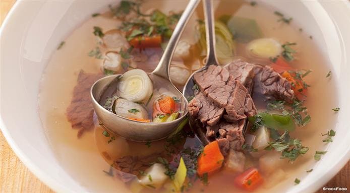 Once the stock is ready, remove the pieces of meat and vegetables. The next step is to strain the liquid through a kitchen towel soaked in very cold water. The contrast between hot and cold will cause the fat to make contact with the cold cloth and remain 'trapped' in the canvas while the liquid is strained into a bowl or large container.