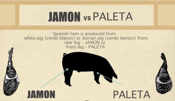 The ham is usually produced with Iberian pigs and the difference between jamon and paleta is that jamon comes from the rear leg and paleta from the front.