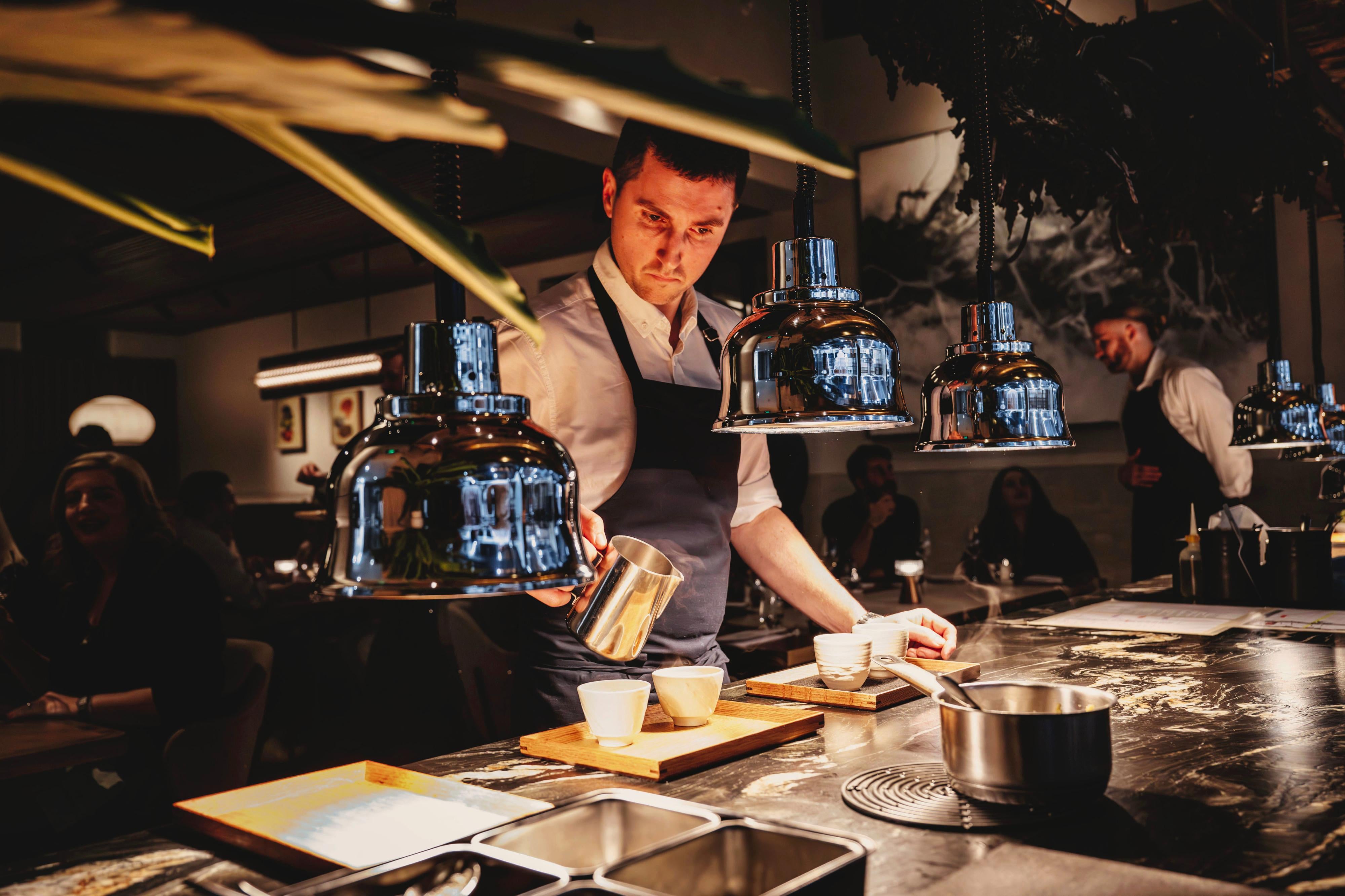 First, put the ghee into the cast-iron pan. I have it so that you've got a thin film across the pan. Generally speaking, if I'm cooking approximately one to two portions of fish in a standard 28-centimetre frying pan, then I'm using 50ml of ghee. Get it to a point over medium heat where you're getting a haze over the pan and a light smoke. You really don't want to play around with the heat too much.
