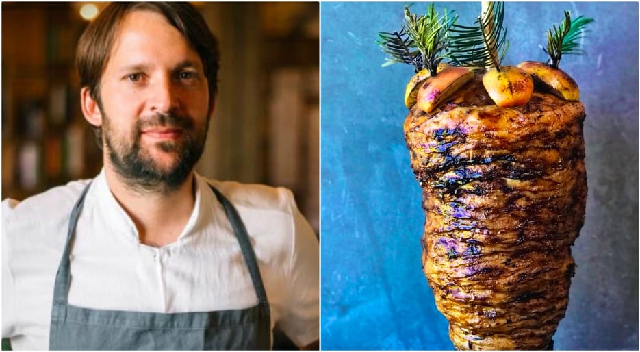 In the same way the Noma shawarma features thin slices of celeriac covered in various purees made from more celeriac, truffle and umami-packed fungi. The shawarma tower is then cooked on a bbq, with apples spiked at the top so that the juice runs down onto the 'meat.'