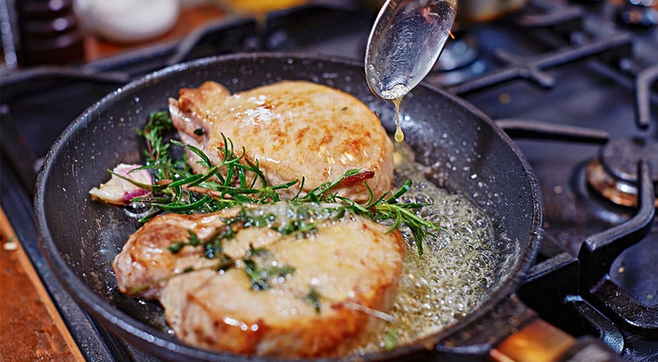 Cooking a great pan-fried pork chop doesn’t differ much to cooking regular steak on the stovetop. Treat it like steak - so make sure the pan and oil are hot, season well on both sides before adding to the pan, and cook in the hot oil over medium high heat. You can substitute butter for the oil if you prefer - it will add a depth of flavour that oil won’t. After you add the pork chop to the pan, tilt the pan to scoop up the melted butter or oil to regularly bathe the top side of the meat with the hot fats.