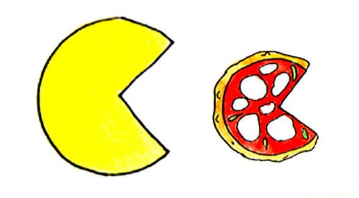 Despite being covered in cheese, tomato and grease from the pork fat, this round pizza pie, missing a single slice, suddenly appeared to the designer as a yellow shape with a wide gaping mouth. In his imagination, it looked like a creature that needed to eat, not a dish to be eaten. “Pacman” was born.