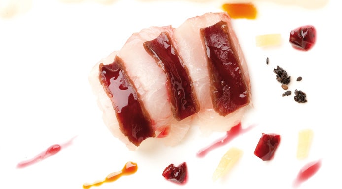 Creative sushi recipe with roe deer, amberjack fish and artichoke sauce, by the famous Italian chef Moreno Cedroni