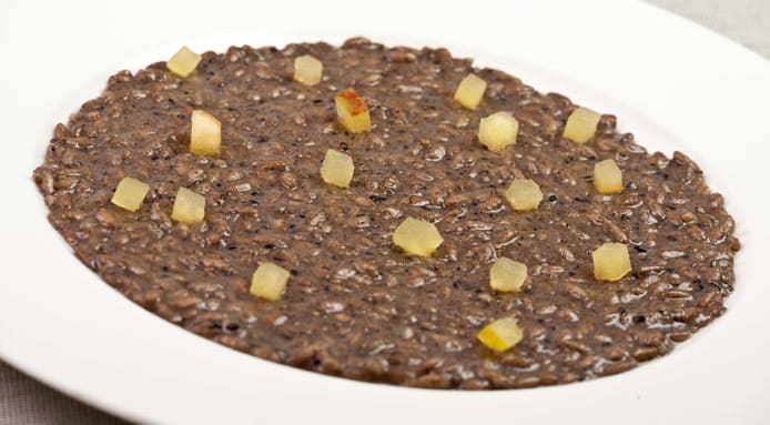 Risotto with black sesame and apple, a classic Italian rice recipe by Chef Carlo Cracco from Cracco restaurant in Milan