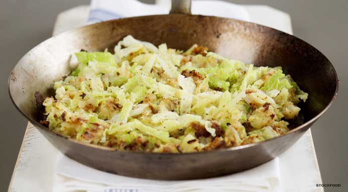 Add the milk and the butter to the potatoes and cabbage and season well with salt and pepper.