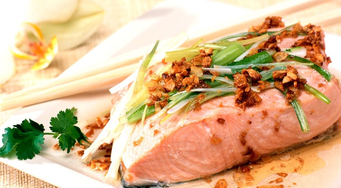 Find out this Cantonese Style salmon fillet recipe: the fish is steamed and seasoned with tasty garlic oil. A simple and healthy Chinese food.