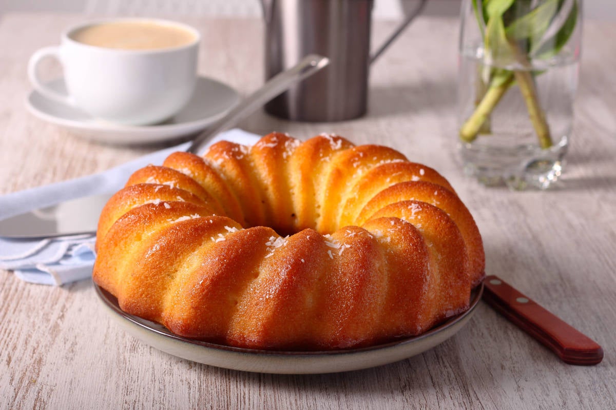 Heat the oven to gas 3, 165°C, fan 145°C. Grease a 10-inch Bundt pan and sprinkle the shredded coconut evenly on the bottom of the pan.