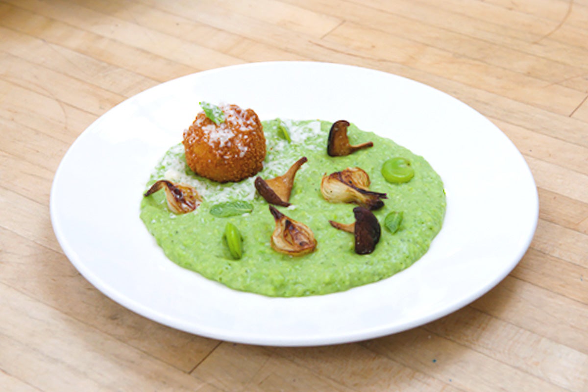 The discards are then used to make arancini, along with grated parmesan rind, an umami-rich ingredient that is often thrown away.