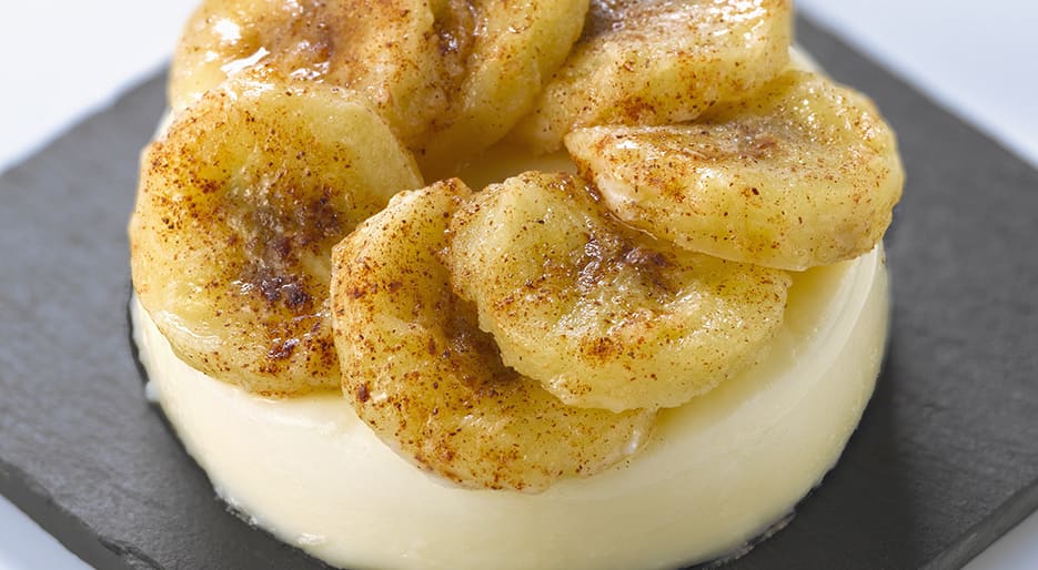 An alternative recipe for a yummy panna cotta topped with delicious flambée banana discs and cinnamon: it's a great dessert for any special occasion.