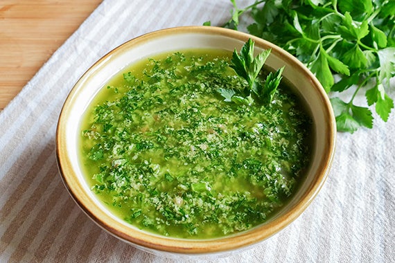 This recipe calls for garlic but if you prefer a lighter version, remove the inner core from the garlic clove. In this way, your green sauce will be more digestible.