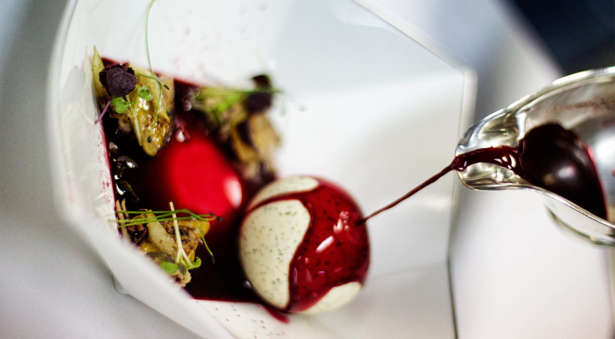 A delicious Russian food recipe revisited by the famous Russian chef Anatoly Komm, for a hot borscht soup with foie gras and sour cream