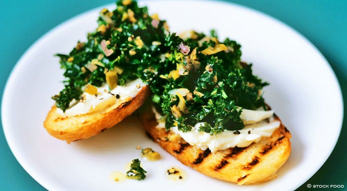 Italian Crostini Recipe topped with sautéed kale and mascarpone