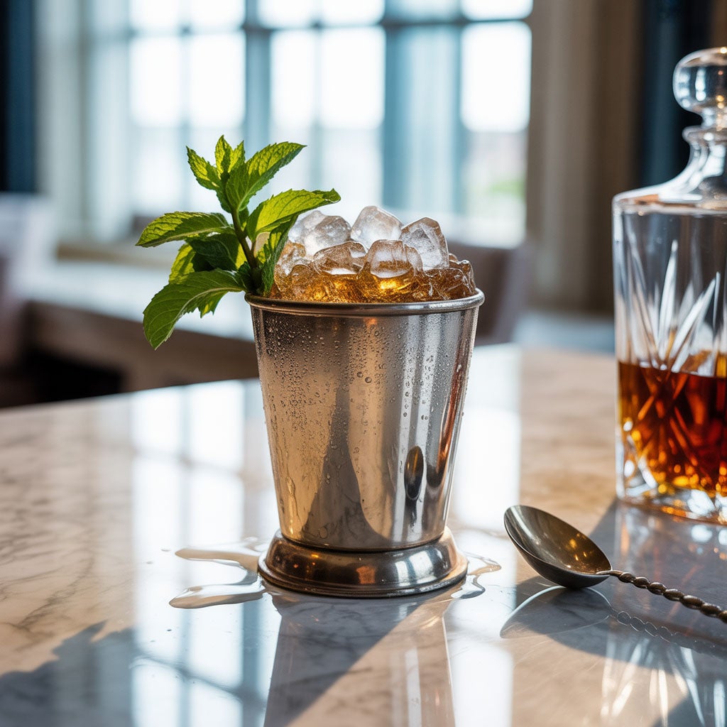 A mint julep is always traditionally served in a metal, pewter cup. Packed full of ice, it frosts over and keeps the drink cool. The drink was created this way to stay cool as long as possible during the intense heat of the summer in the Southern states. Alongside the visual appeal, it also keeps the flavors fresh and you can easily taste the difference between a mint julep made in a glass, and one made in a metal cup.