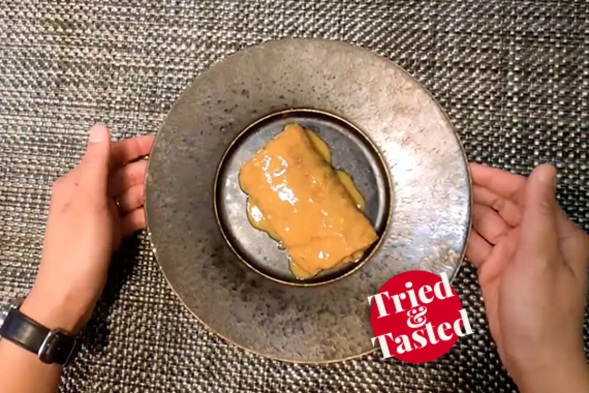 To plate, portion your eggplant omelette, warm your takimiso, and glaze eggplant omelette to finish.