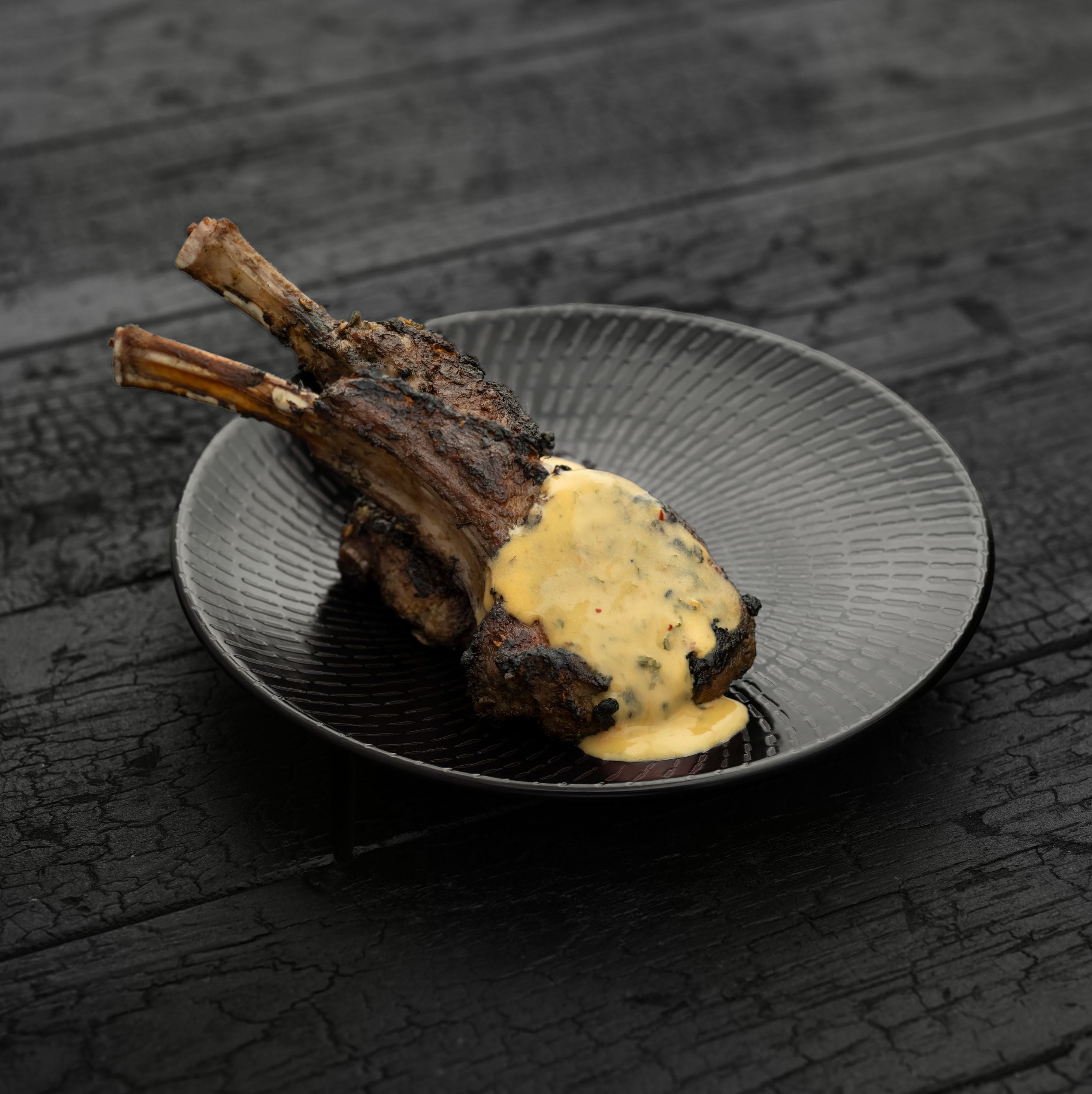 Remove the lamb from the marinade and set aside 15g of marinade per portion to be served. Cook the lamb cutlets over a hard-grill, ensuring both sides are well charred, the internal temperature reaches 50°C and the meat has heaps of colour.