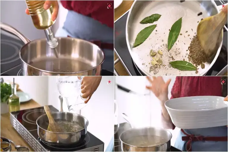 Heat oil in a pan. Once hot, add the cumin, crushed cardamom, bay leaves and cloves.