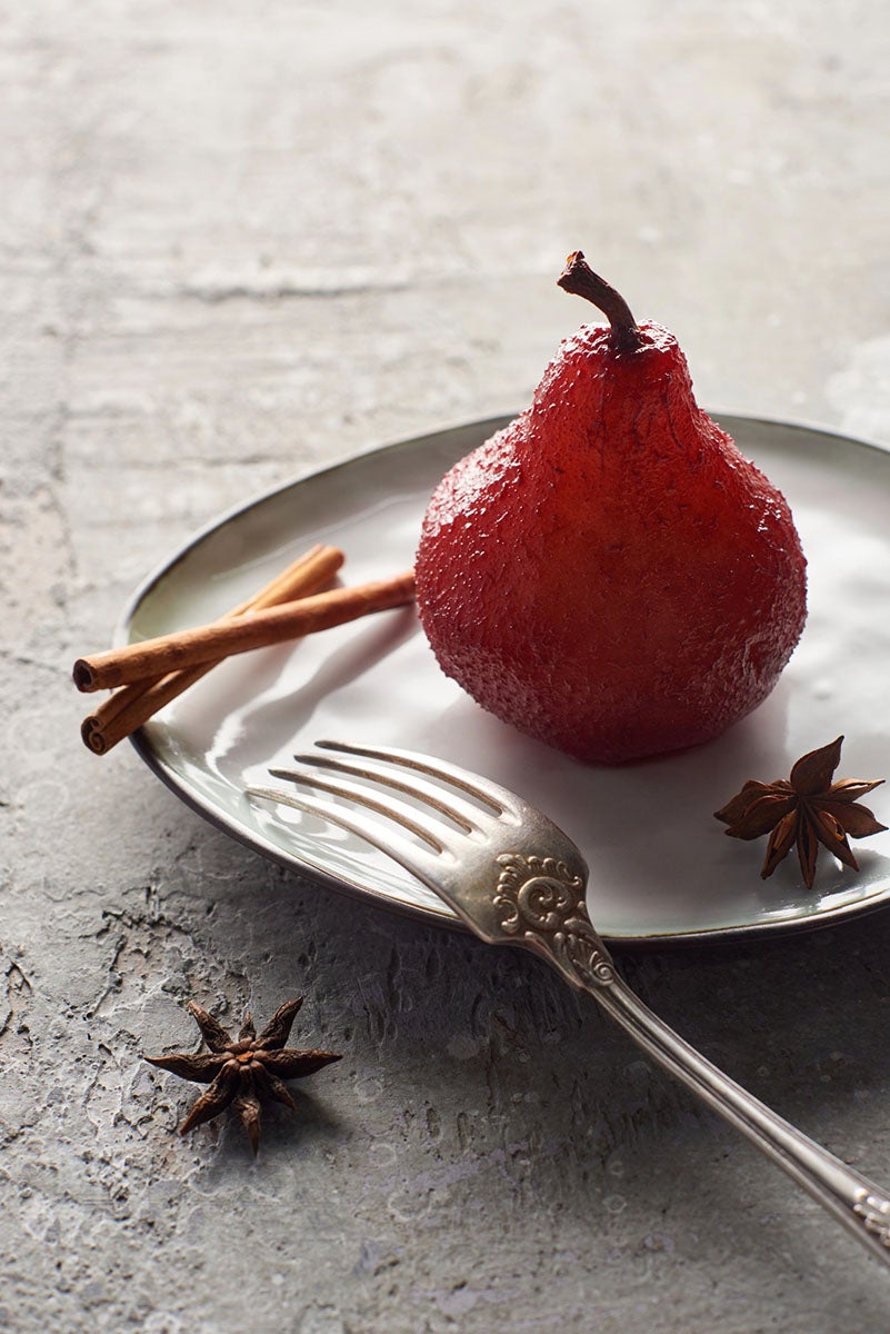 For the presentation, position the pears whole in a delicate, glass serving bowl, sitting in the red wine reduction. A small cinnamon stick, or sprinkle of toasted hazelnuts, are both refined garnishes for the dish.
