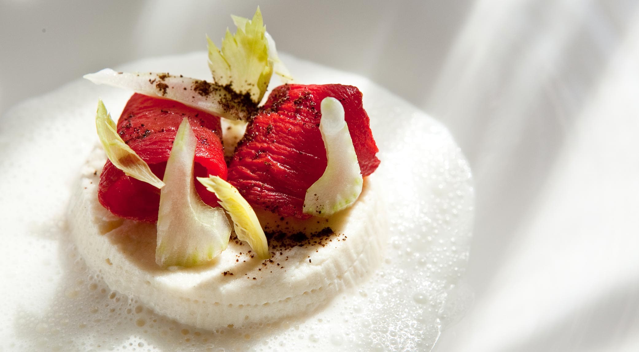 Place the radish at the centre of a small bowl, the almond sauce, the tomato, the celery and a sprinkle of ground coffee.