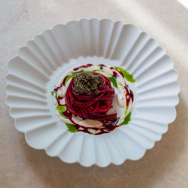 Spaghetti cooked in beet juice with vodka, yuzu, and osetra caviar