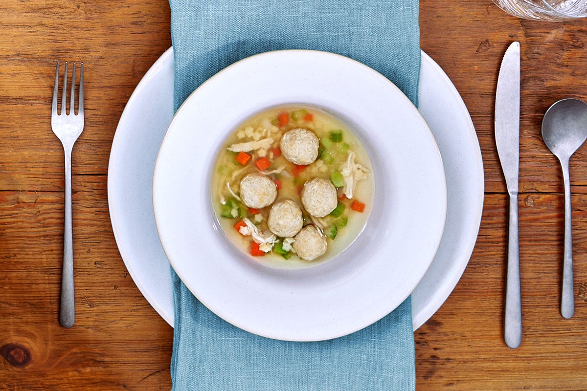 Bring the broth back to a simmer, add the shredded chicken breast, diced carrots, celery and onion so that they warm through for about 30 seconds to 1 minute.