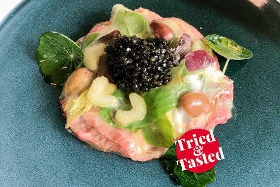 Pour the mustard and honey sauce, the Taggiasca olives on top and cover with the beef jelly. Finish with the caviar.