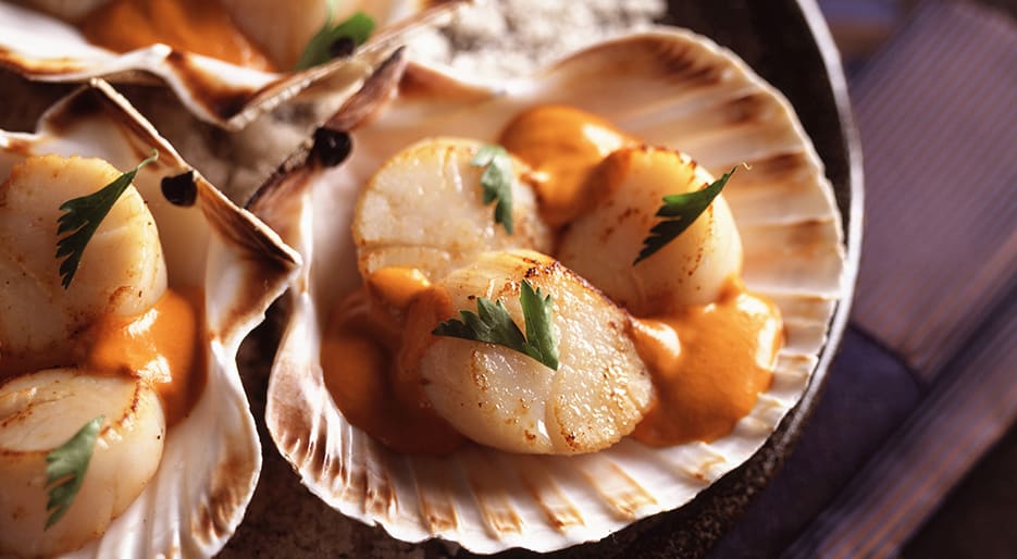 Set the shells on the mounds of rock salt; pour the roe sauce into the shells then arrange three scallops in each shell.