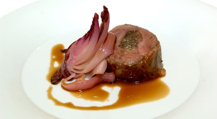 Place a slice of lamb at the centre of the plate, add a slice of braised raddichio and onion and then the lamb juices.